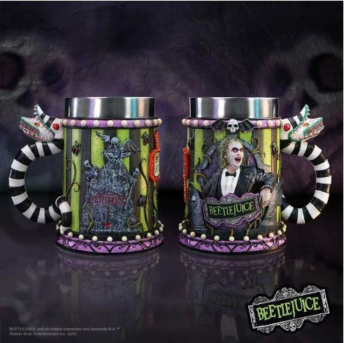 This high-quality ceramic Beetlejuice Tankard captures the essence of Tim Burton’s iconic film with its textured details and vibrant, accurate colours. The sculpted handle, shaped like the two-headed sandworm, complements bold black and green stripes, while a mischievous portrait of Beetlejuice adorns one side. Hand-painted for unique character, it arrives in an officially licensed collector’s box featuring original artwork and protective inserts—ideal for fans, horror collectors, and Halloween enthusiasts seeking a distinctive piece of movie memorabilia.