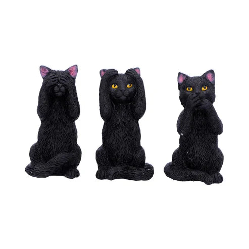 The Three Wise Felines from Nemesis Now’s giftware collection feature three black cat figurines, each standing 8.5cm tall and hand-painted with detailed craftsmanship. Standing upright on their hind legs, these cats emulate the classic “See no evil, hear no evil, speak no evil” poses with front paws covering eyes, ears, and mouth, respectively. Their concerned expressions convey a poignant reminder of ancient wisdom, making this set a thoughtful and distinctive gift for cat lovers who value timeless principles.