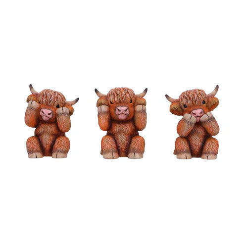 These three wise highland cows, crafted from fine resin and carefully hand-painted, embody the timeless Confucian principle of "See no evil, hear no evil, speak no evil." Each 9.6cm figure captures a distinct gesture—one covering its eyes, another blocking its ears, and the last clasping its mouth—offering a charming and thoughtful decoration that blends artistry with meaningful symbolism. Ideal for collectors and admirers of cultural icons.