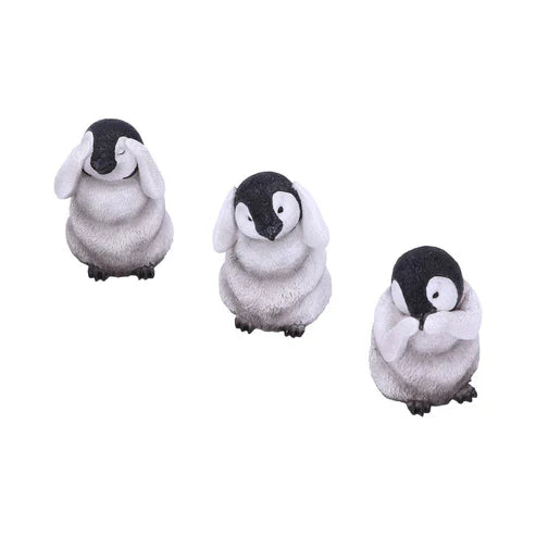 The Three Wise Penguins set features three hand-painted resin baby emperor penguins, each measuring 8.7cm. These charming chicks sit with their small claws visible beneath their plump bodies, embodying the ‘see no evil, hear no evil, speak no evil’ maxim. One covers its mouth, another its ears, while the third hides its eyes but sneaks a peek regardless, capturing both wisdom and playful innocence. Perfect for collectors and animal enthusiasts, this delicate set adds thoughtful charm and distinctive character to any display.