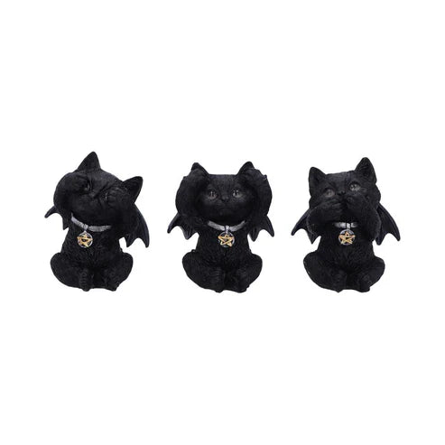 These Three Wise Vampuss figurines stand 9cm tall, featuring charming vampire cats with delicate bat wings and tiny fangs. Each kitty adopts a classic pose—covering its eyes, ears, or mouth—while their expressive eyes add a hint of mischief. Expertly cast in high-quality resin and hand-painted with precision, these unique pieces blend gothic whimsy with traditional symbolism, making them a distinctive addition to alternative décor or eclectic collections.