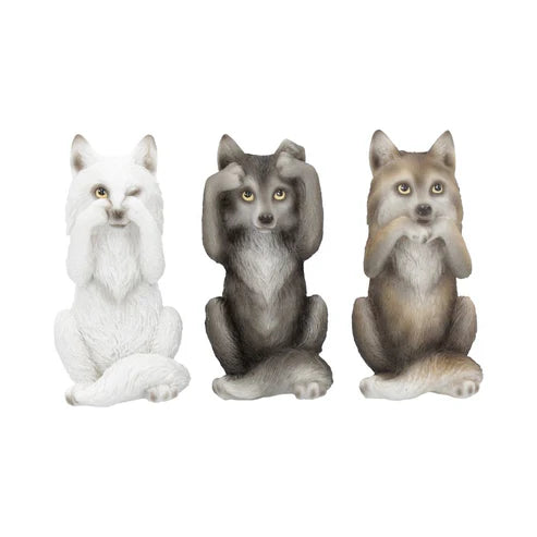 These Three Wise Wolves, measuring 10cm each, are inspired by the creative vision of Nemesis Now’s design team. Crafted from premium resin and expertly hand-painted, each wolf embodies the classic 'see no evil, hear no evil, speak no evil' pose with captivating, expressive eyes—one covers its mouth, another its ears, and the last its eyes while playfully sneaking a peek. This unique set combines artistic detail with meaningful symbolism, making it an exceptional addition to any collection or décor.