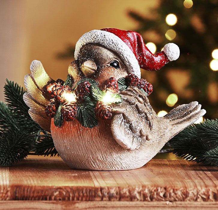 Bring festive warmth to your home with this traditional red-breasted robin ornament, featuring a light-up chest illuminated by 3 LED lights within an acorn-detailed garland necklace. Crafted from durable polyresin with a glitter finish, it measures 14 cm high, 18.5 cm wide, and 14 cm deep, making it ideal for windowsills, mantles, or tabletops. The design may vary slightly, and it requires 2 AAA batteries (not included). Packaged in a box, this charming piece adds a classic holiday ambiance to any setting.